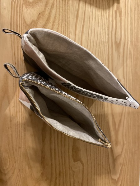 カウニステのハギレで2種類のポーチを作りました。まちが浅いほうは娘からリクエストの筆入れに。