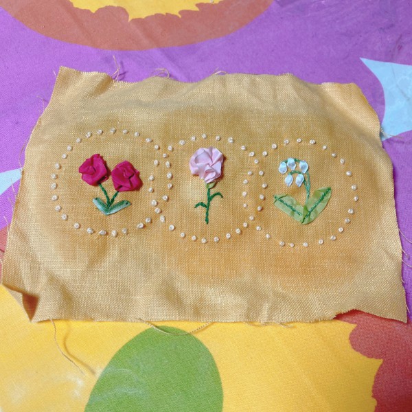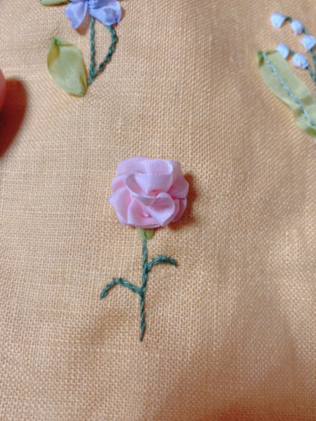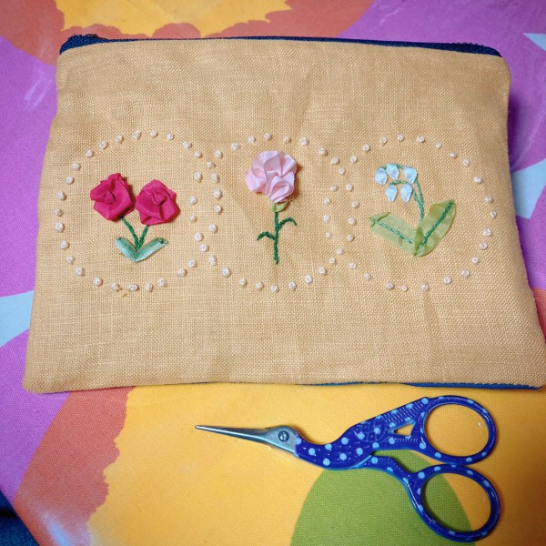 カーネーション、バラ、すずらんをリボン刺繍で刺して、ポーチをつくりました