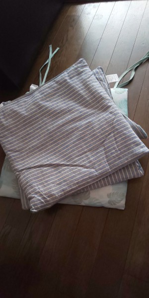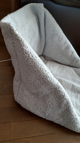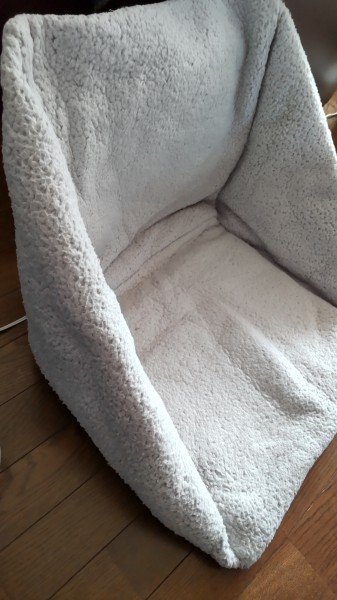 | 過去作品 腰を包むクッション 座面はハニカム座布団を使うので、厚みはあまりいらないが、事務用椅子の腰回りがスースーするのをなんとかしたいので、100均の座布団4枚とホームセンターの養生毛布ダブルサイズ500円位(新品)で作成しました。 |