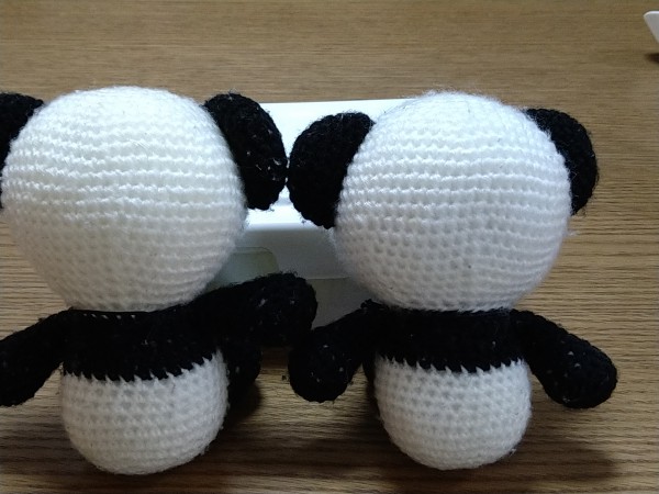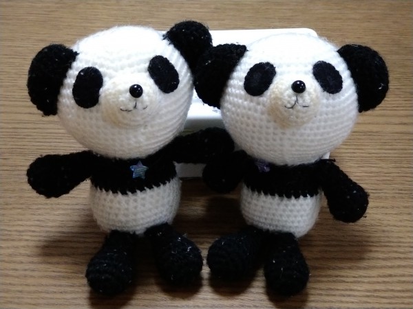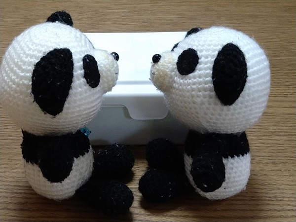| 作ったのは2年ほど前ですが。 当時2歳の娘、パンダが好きなようだったので作りました。 編み図は手元にあった、20年ほど前のあみぐるみ本です。 ハマナカ ピッコロの白、黒の2色で編みましたが、子どもたちがチューしたり舐めたりするので一部変色してきました… 目はフェルトを縫い付けています。 |
