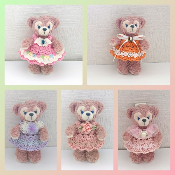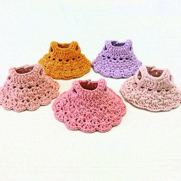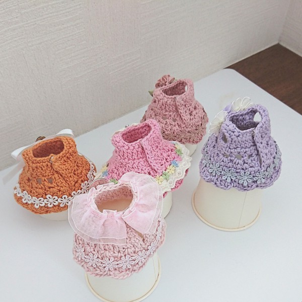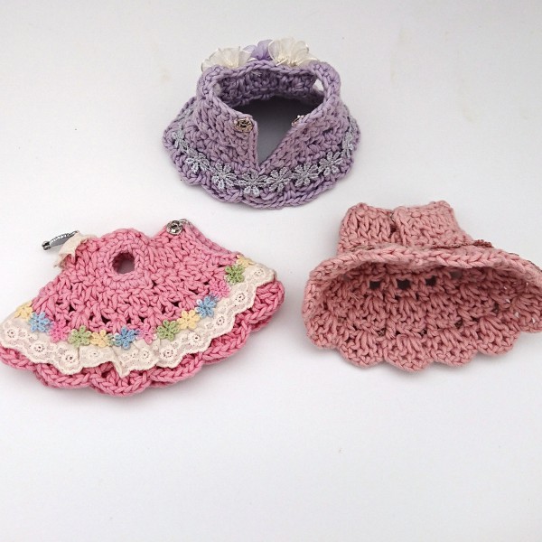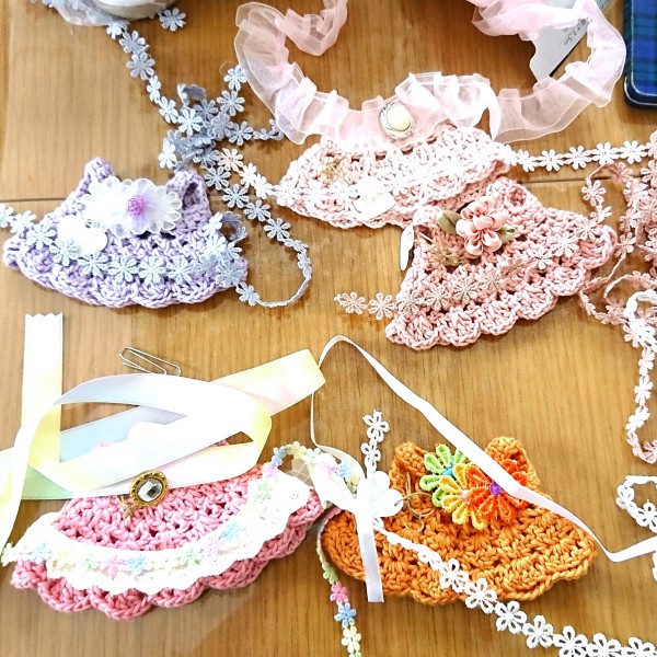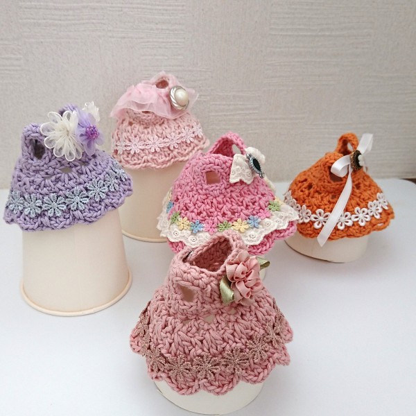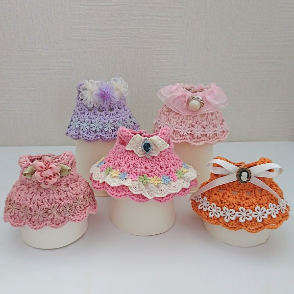 スカートの編み方を少しかえながら、ワンピースを5枚編みました。 手持ちの素材を使って飾ります。