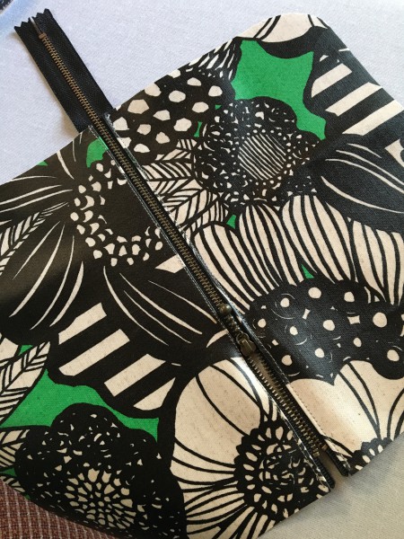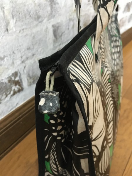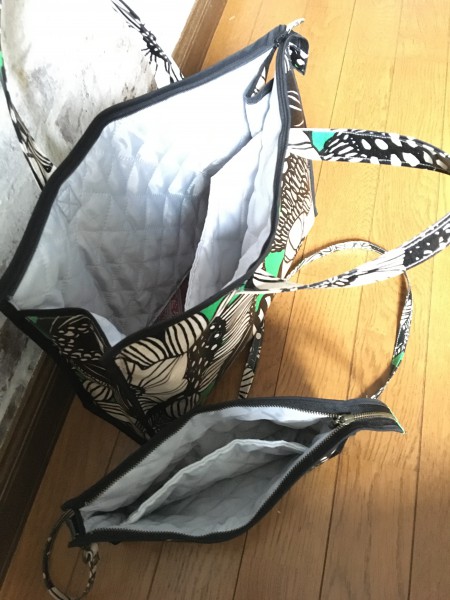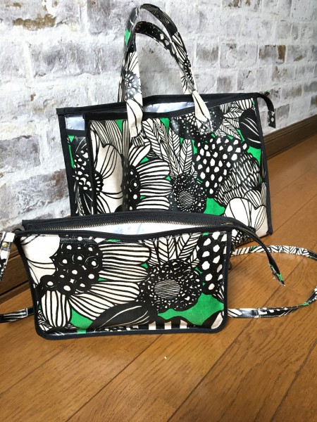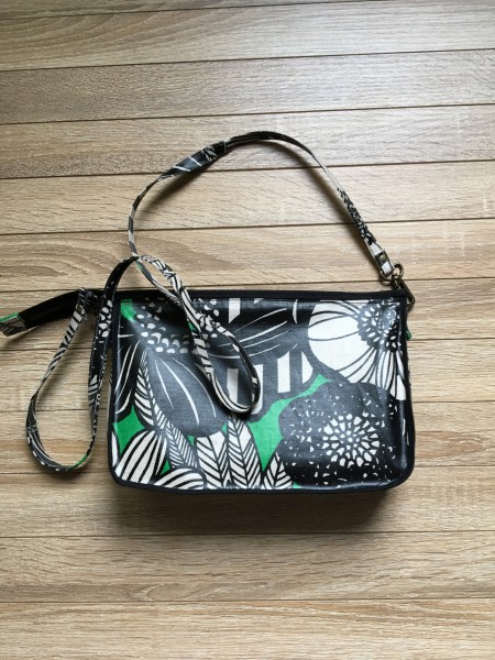 ラミネート生地の紙袋タイプニ作目。残り布でポシェットも出来ました。長さが取れず紐が剥ぎ剥ぎです。