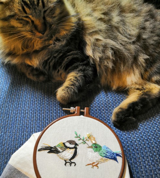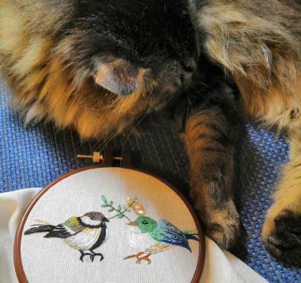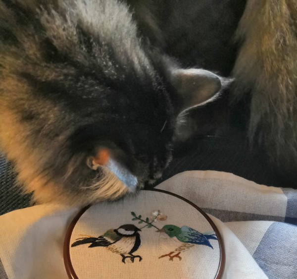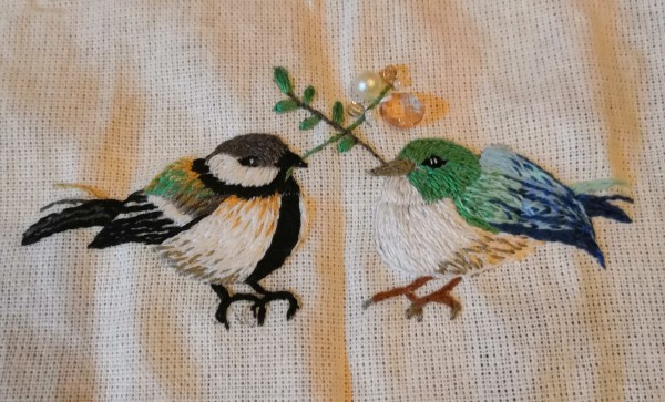 見本では二羽の青い小鳥だったのですが、手持ちの糸では色合いがうまくいかず、左の鳥は色を変えて庭によく来るシジュウカラに変更