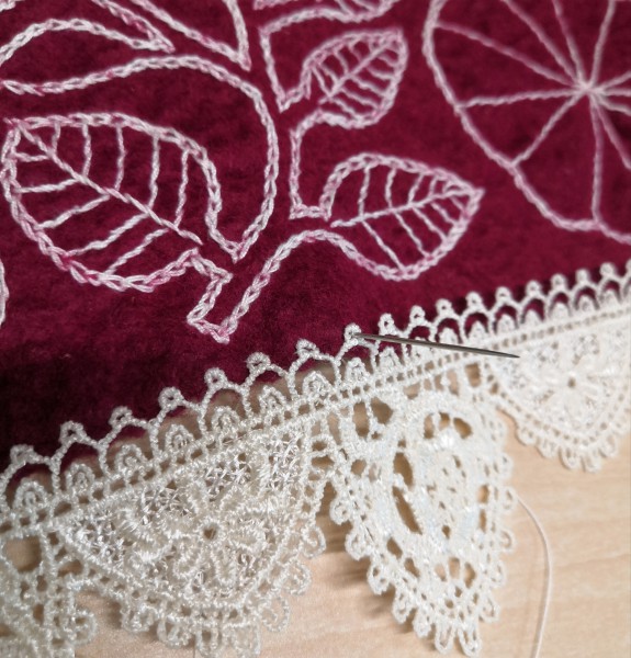 直線で縫うと布の歪みが目立ちそうだなと悩んでいたので、レースだと手縫いで自然に縫いつけられそうですね(◍•ᴗ•◍)*。