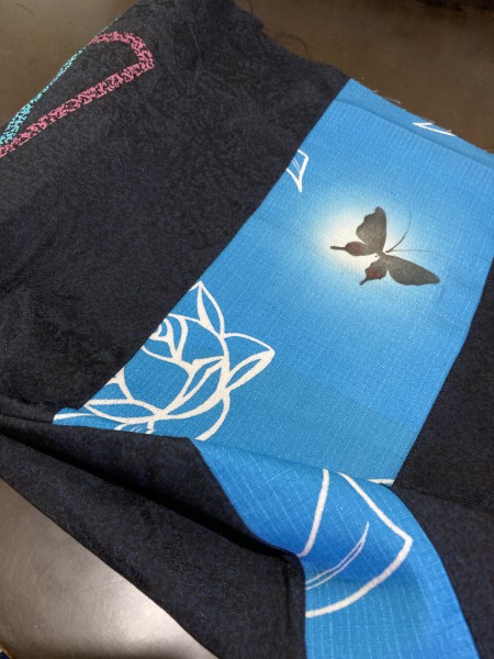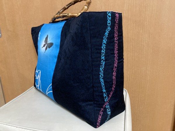 | 着物を誂えた時に戻ってくる「あまりきれ」を使った和装バッグです。 A4位のサイズ感。マチは12センチ。着物の時のお出かけもつい荷物が多くなりがちなので、これで安心です。 2種類ともろうけつ染なのですが、薔薇と蝶をいい感じに載せられました。 |