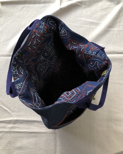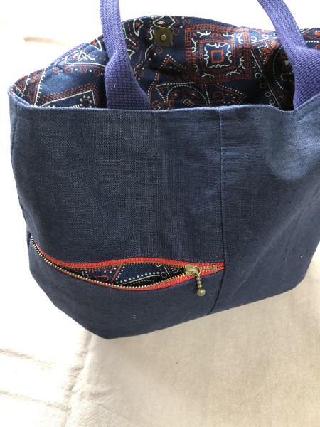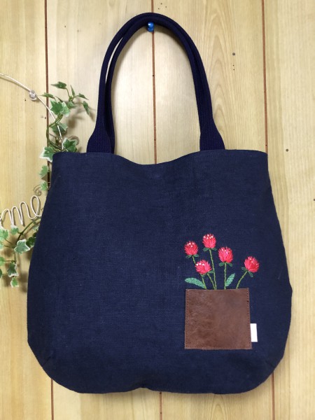 表面に千日紅の刺繍、後ろにはファスナーポケット、内袋は赤系のバンダナ柄、赤の差し色を意識してみました。