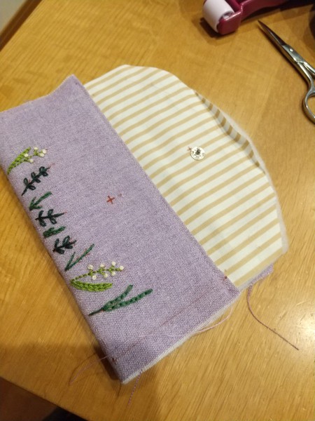 この段階で、ふた部分のスナップボタンを縫い付けます。