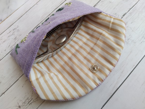 あとは表に返して返し口をまつり、ふた部分のステッチと本体部分にスナップボタンを縫い付ければ完成です。
