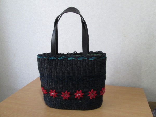 全体を黒でシックにまとめ、毛糸を織り込み赤のウール刺繡をした布を巻き付けて、さらに上部分に青緑の麻ひもをアクセントに加えて暖かみのある大人可愛いバッグに仕上げました。