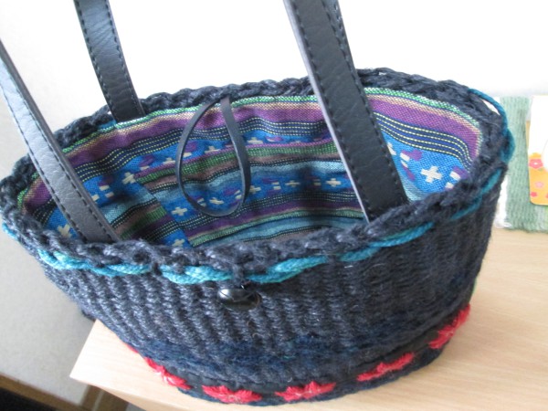 黒の麻ひもを使っておりりん大の輪織りバッグを作成。途中に紺色毛糸と上の部分に青緑の麻ひもを使用。