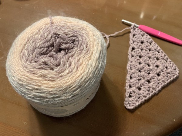 ほぼひと玉分編めました。底辺110㎝、高さ55㎝。きれいな直角二等辺三角形です。私の記憶の中にある昔使っていた三角ショールにかなり近づいていて嬉しい。。もう少し大きくしたいので、もうひと玉は外側から糸を使ってグラデーションを戻って行きます!グレーの範囲が多くなりすぎちゃうかな…。。