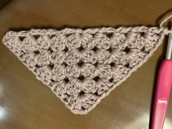 22段目途中で淡いピンク一色になりました。ラベンダーの混ざった部分は68グラム(約45%)、三角形の高さ35㎝まで編めました。
