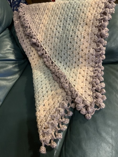 縁編みに入りました。パプコーン編みで小さいポンポンを作って鎖で繋いでいきます。