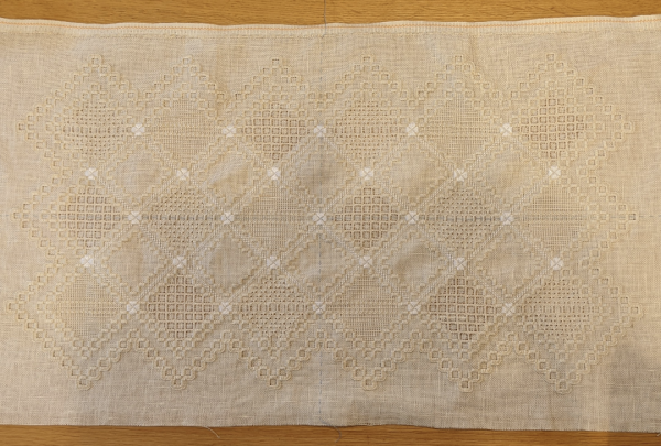 | 「ひとみの小部屋」さんから購入した、上級4·Doilyです。 ハーダンガー刺繍を知ったのは、かれこれ10数年前。 刺繍のネット検索をしていて「ひとみの小部屋」さんを見つけて一目惚れ。 初心者から中級、上級用と分けてキットを販売されているので、基本のドイリーから始めて、難易度を少しずつ上げて、今では上級の物を刺繍できるようになりました。 画像入りのステッチの説明書がついているので、全てファイリングして、今では大切なテキスト代わりとなっています。 最近レース編みに夢中になっていたので、ハーダンガーはしばし放置状態に(>o<) アジュール模様は全て完了しているので、これからかがり作業に入ります。 |
