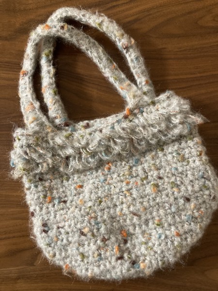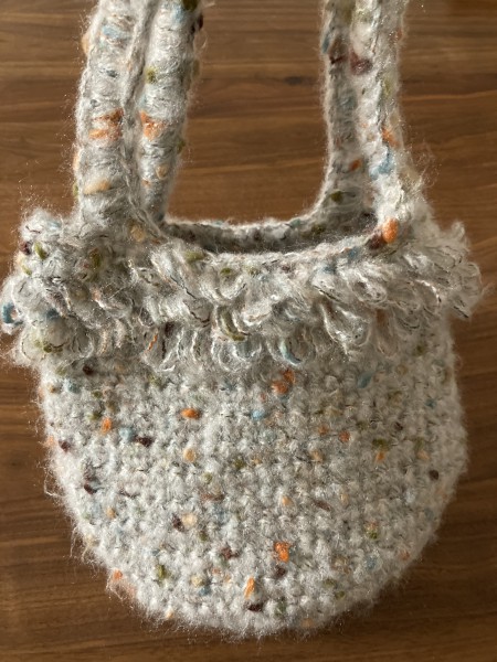 ループのふわふわデザインが可愛くて編みました。持ち手を編むのに苦労しました。
