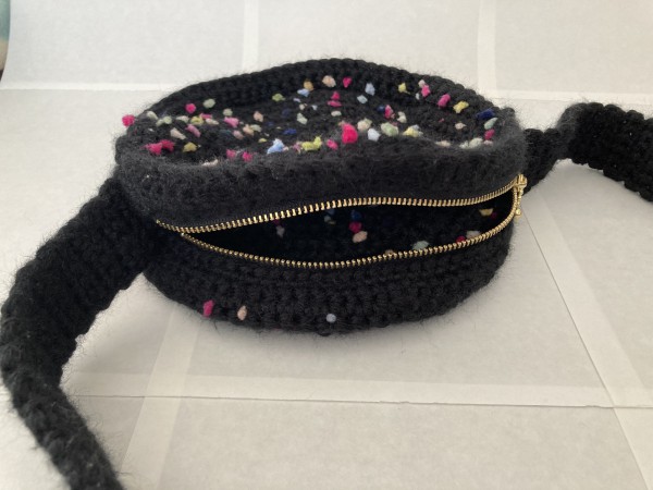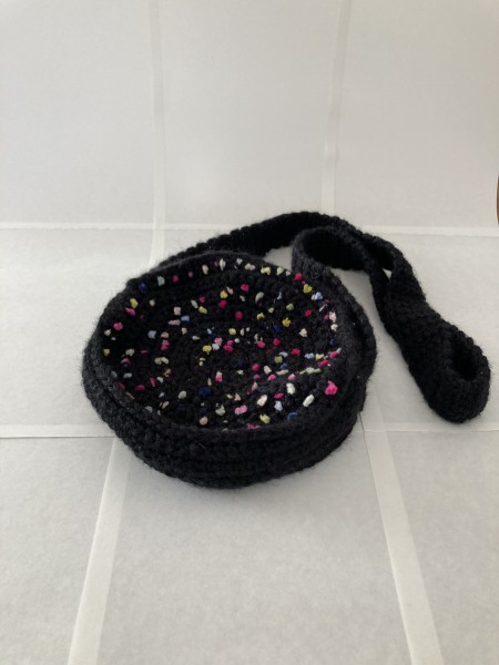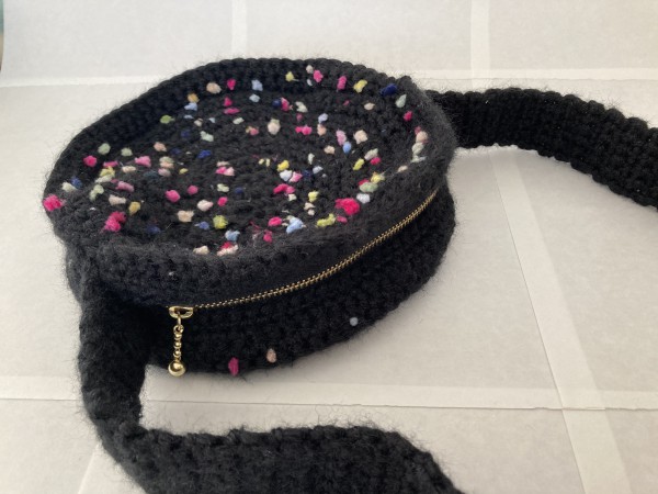 ラウンドポシェット。肩紐は子どもサイズ。小さい財布とスマホが入る大きさ。取り出し口はファスナーにしました。