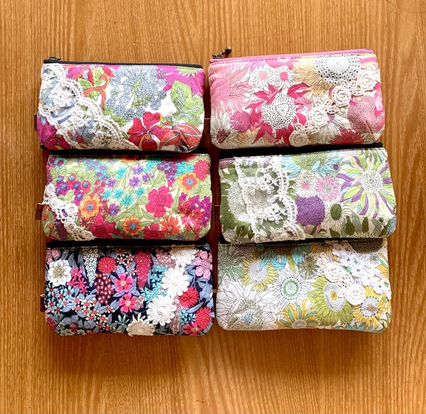リバティ生地のポーチ11個。少々レースをデコりました。メガネケースにぴったりサイズです。やっぱりリバティ生地はかわいいです♪