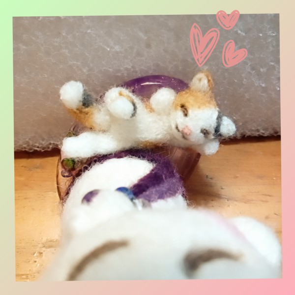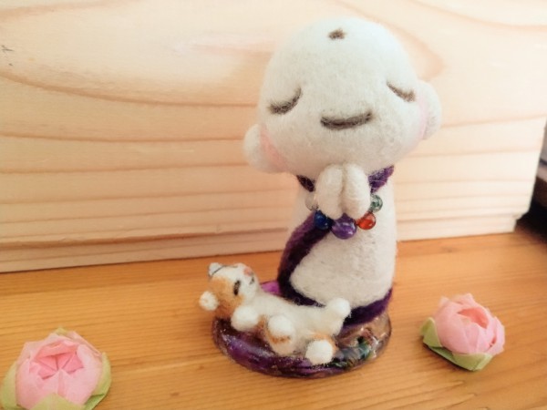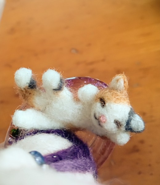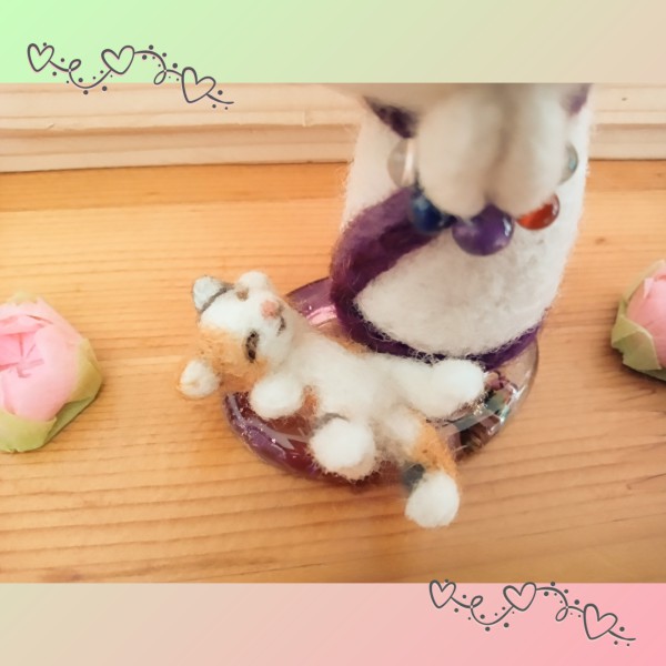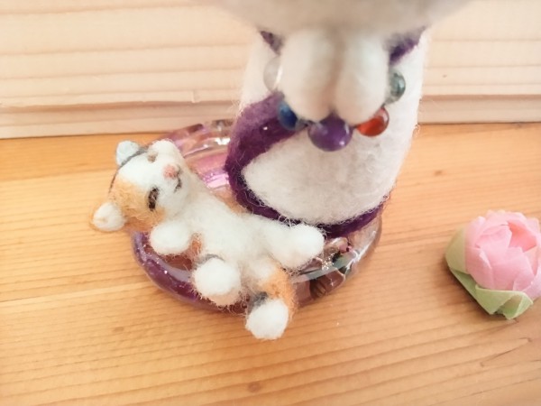 羊毛フェルトでヘソ天猫を作りました。お地蔵さまにかまってほしい猫を再現してみました