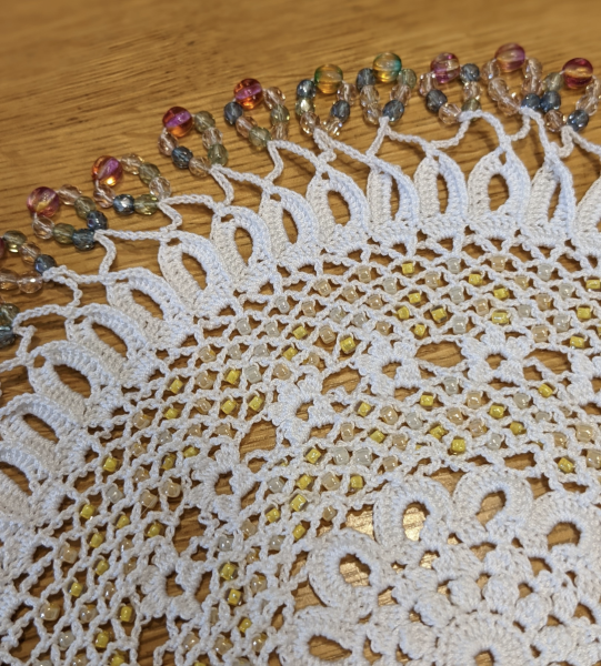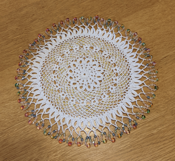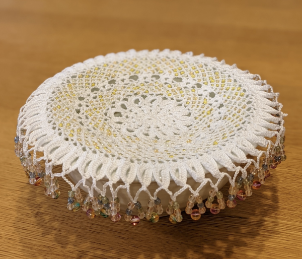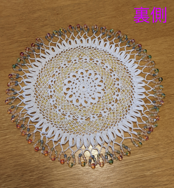 | 手芸本「ビーズで彩るレース編み」の中から、スワロフスキービーズをチェコビーズに変えて、ジャグカバーを編んでみました。 パプコーンという初めての編み目にも挑戦。いろんな編み目があるのと、ビーズの編み込みで、楽しく編むことができました。 でも、うちではジャグカバーよりは、ドイリーとして使うかなぁ。 |