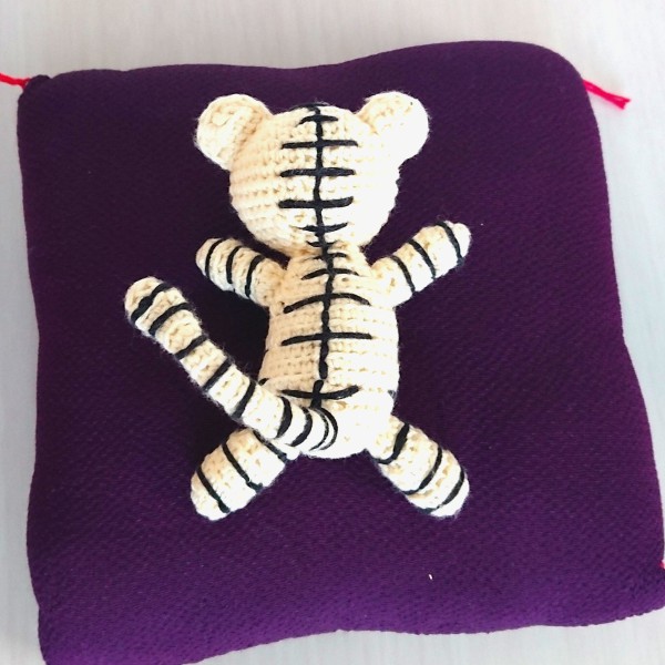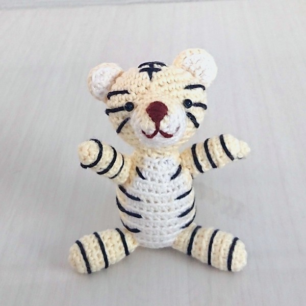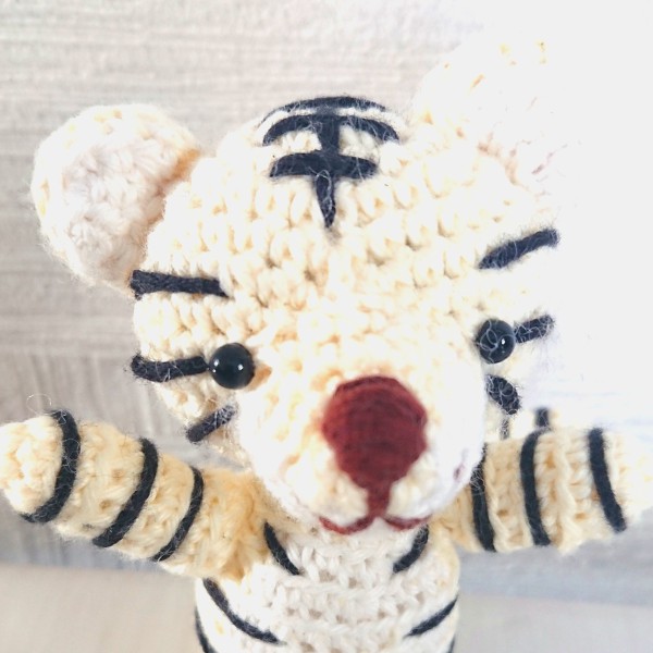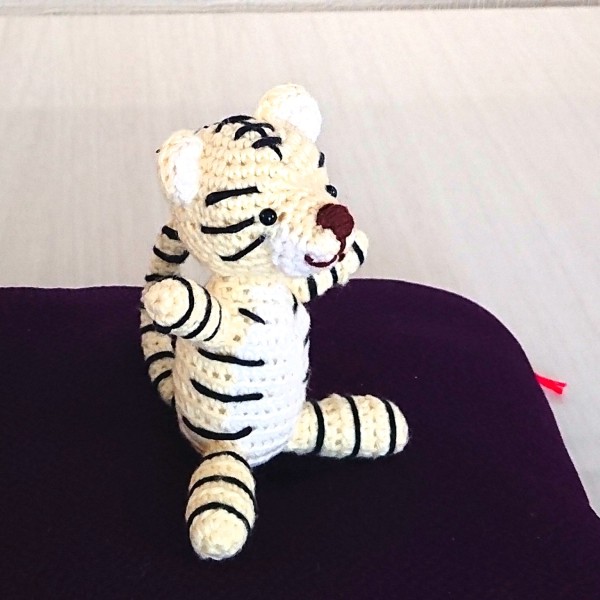 | 年賀状に使おうと来年の干支のトラのあみぐるみを編みました。 新年用なので前向きな感じに、顔は上向き、両手を上げてみました。 しっぽにワイヤーが入っています。 |