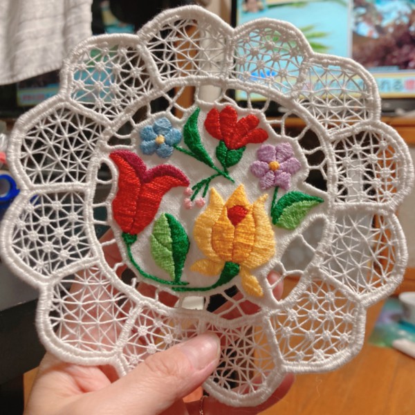 | ハンガリー刺繍のカロチャ刺繍でドイリーを作りました。 周りもリシェリューという刺繍になります |