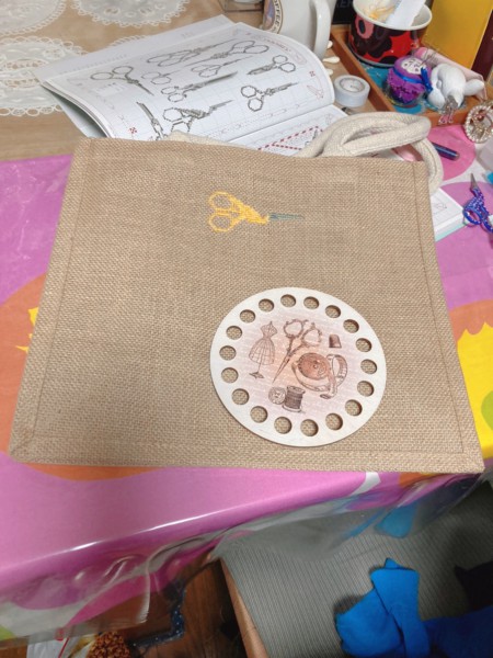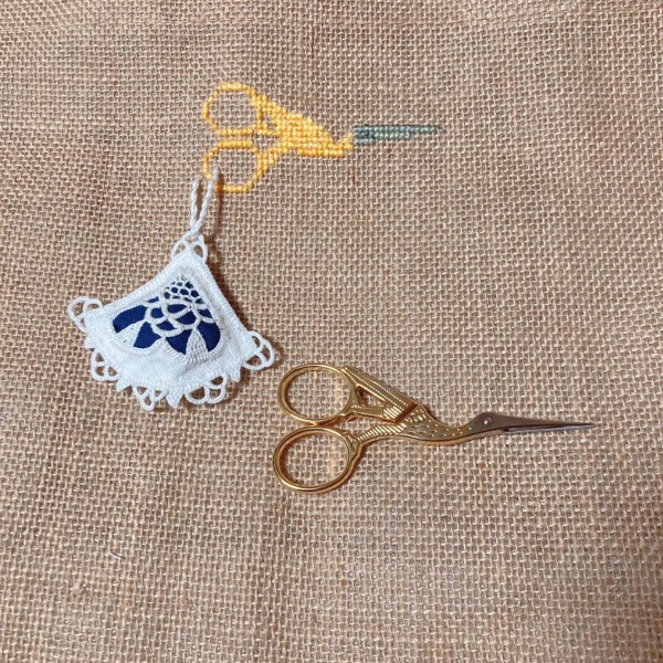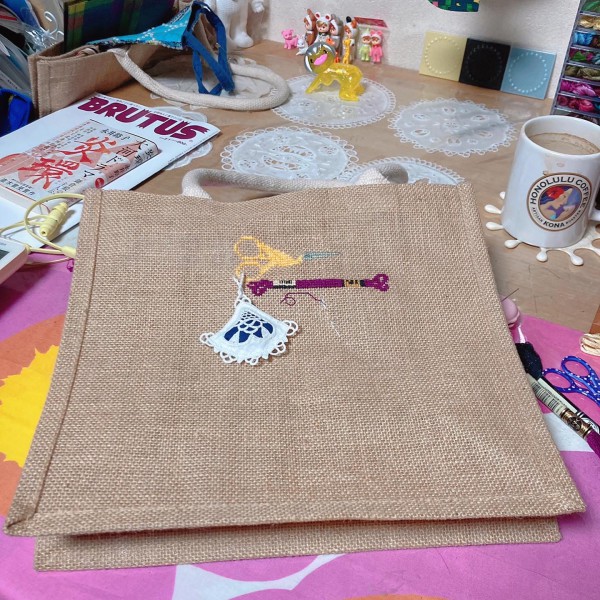 ジュートバッグにこうのとりの糸切りばさみをクロスステッチで刺し、へデボ刺繍のシザーキーパーをゆらゆらと揺れるようにつけました。
