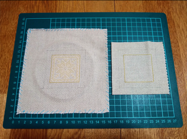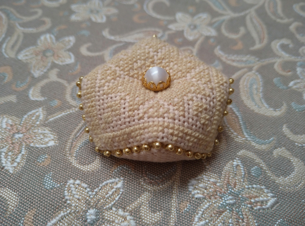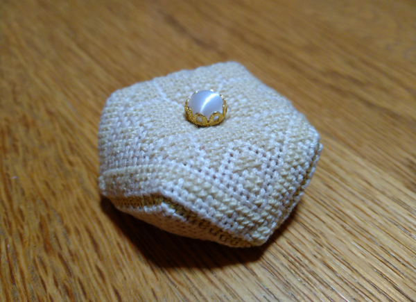 | 初めてビスコーニュを作ってみました。 小さい物が欲しくて、図案はネットで好みのを見つけて、18カウントのコングレスに刺しました。 大きさは5センチ位(コットンパール大)で、色を抑えめにしたので、あまりステッチは目立ちませんが、真ん中のボタンに合わせて、巻かがりのところに後付けでゴールドのシードビーズを縫い留めたので、華やかな感じに仕上がりました。 苦労した点 ・巻かがりがズレないように気を使いましたが、綿を詰めて形になった時は地味に感動しました(^^) ・ビーズはビーズ針が必要なことを知りました(^_^;) そして、ビーズは1目おきに縫い付けようと思っていたら、元の一辺のステッチが35目だったり、目を数えるのも大変なので、感覚で角〜角の間に5粒にしました。間隔に少しばらつきが出てしまいましたが、自分用なのでご愛嬌。でもビーズ刺繍もやってみたくなりました! |