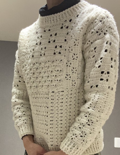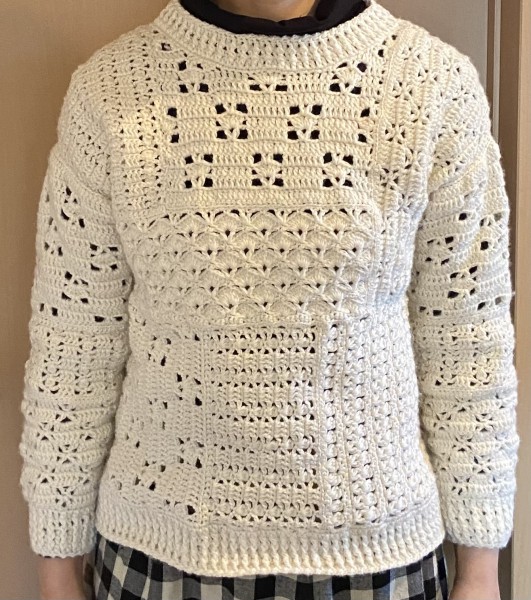 | 「岡本啓子のあみもの かぎ針あみ クロッシェ編み地のサンプラー、究極のパッチワークウェア」を参考に、試行錯誤しながら編み進めました。いろんな模様があるのでとても楽しかったですが、反省点もあるので、来シーズンに違う糸で作ってみる予定です。 | |