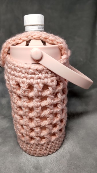| ボトルケースにさらにカバーを付ける愚行 お気に入りのボトルケースをぶつけたり落としたりと、傷をつけてしまい、これ以上ボロボロにしたくなくて、カバーを作ることにしました。 とりあえず手元にあった極太毛糸でどういう形にするか試行錯誤しながら編みました。 普通のペットボトルカバーと違い、ハンドルが付いていてくびれがなく、巾着のように絞れないため、固定する方法を色々考えました。 はじめは上部を真ん中の開いたフラップ式にしようかと思ったのですが、うまく行かず、簡単に紐で固定するようにしました。 家にあったコンチョボタンを付けたので合ってないけど完成ということにします。 春夏用にコットン糸でも作りたいと思っています。 |