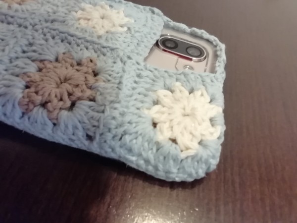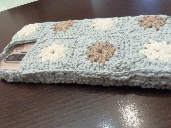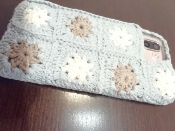 使っていたスマホケースがボロボロになったため、モチーフ編みのカバーを即席で作ってみました。古いカバーのサイズに合わせ、上から貼り付けただけですが。余り糸が有効活用できました。