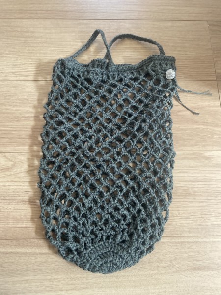 Seeknitの編み物案内に載っていたネットバッグをセリアのジュート糸で編みました。ボタンは昔履いていたジーンズのを使用しました。雰囲気がよくなりました。