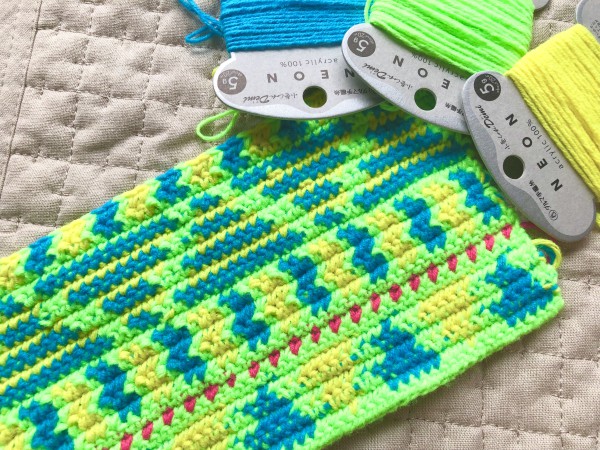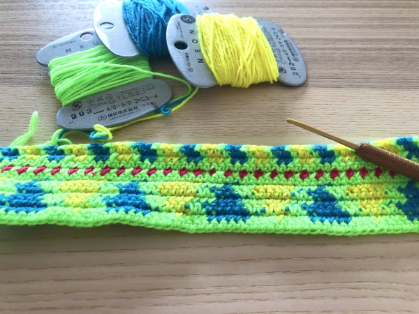 でも、蛍光色の糸が、編んでいて楽しい〜