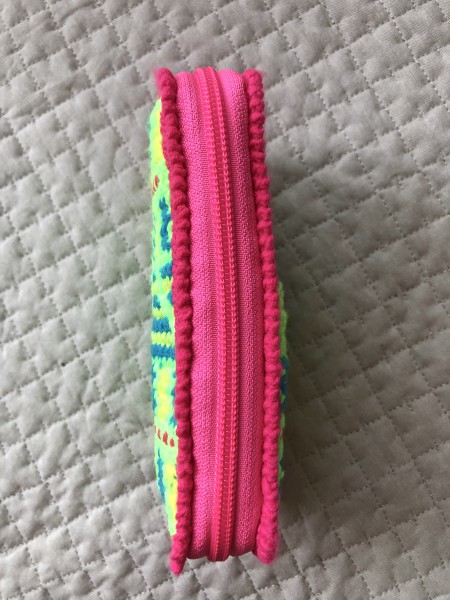 | てといとオリジナルレシピのかぎ針ケース、完成しましたー! 縁の色をピンクにして、内側の色もおもちゃ箱のように明るく楽しみました。 かぎ針編みの、模様編みの糸が表に響かないようにするやり方、ファスナー付けの方法など、最初は上手くいかず悩みながらでしたが、勉強になりました! 何より可愛い〜。嬉しい!  |