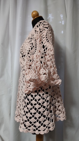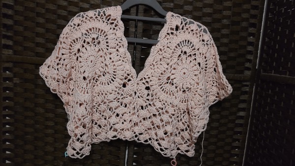 | リカチャンネル編み物部さんで紹介されていました、レース編みでアンティークな雰囲気のサマートップス。 リサイクルコットンのシェルピンクで作ります。 長編みの編み方がまだまだ下手です。 もっと練習しなくちゃ。 長編みの頭が広がらないようにするのが今後の課題です。  |
