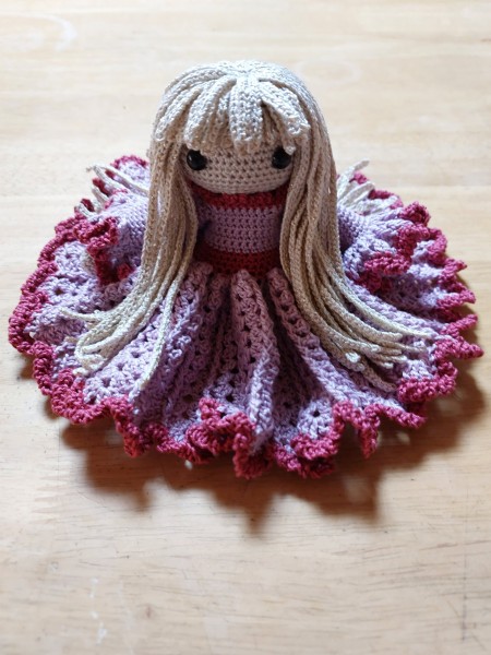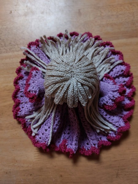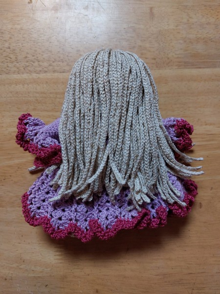 ミニサイズのドールです。すべてレース糸で編みました。髪の毛はレース針の1ミリを使用しています。