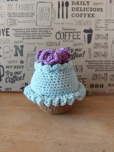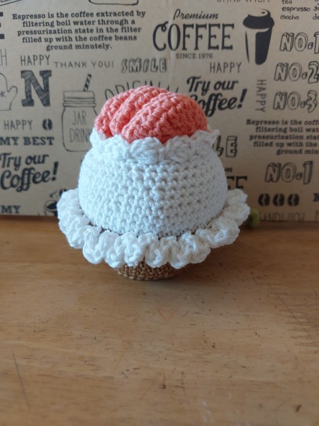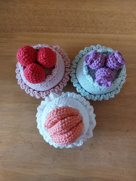 ぽってりとかわいい形になるように編みました。フルーツとクリームの色のバランスが悪くならないようにしました。針山に使えそうです。