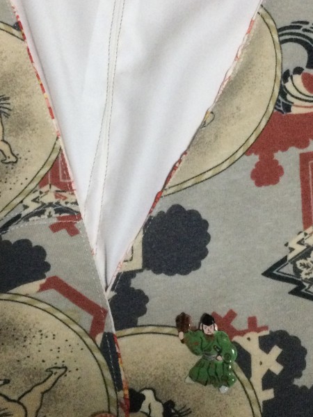 背中と裏地も着物の裏地を利用。暗い色合いなので、裏地の赤が見える様に縫いました。ちょうど行司のブローチがありました。