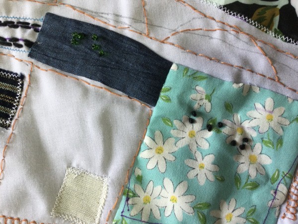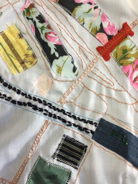 | 「触地図」しょくちずを作りました。聞き慣れない言葉かもしれまん。視覚に障害者のある方が触れてわかる地図です。視覚障害者のグループと駅裏の公園を散策するのに、言葉で説明しても大きさ、形、並んでいる様子、道の曲がり方など、理解して貰いたくて作ってみました。布の手触りや糸の違いで建物、車道、歩道、線路を区別しました。 駅と商業施設に点字をつけましたが、これは勉強不足でした。 |