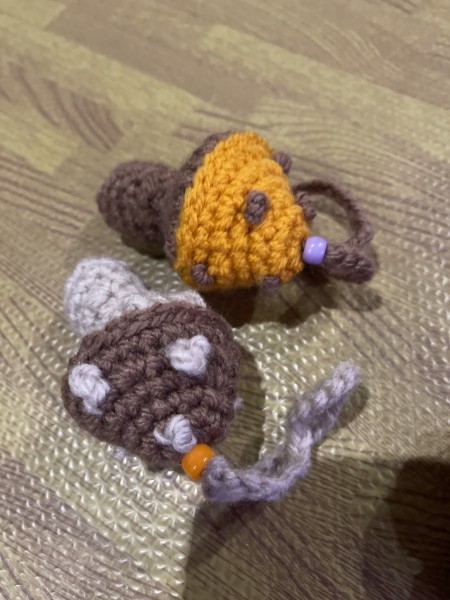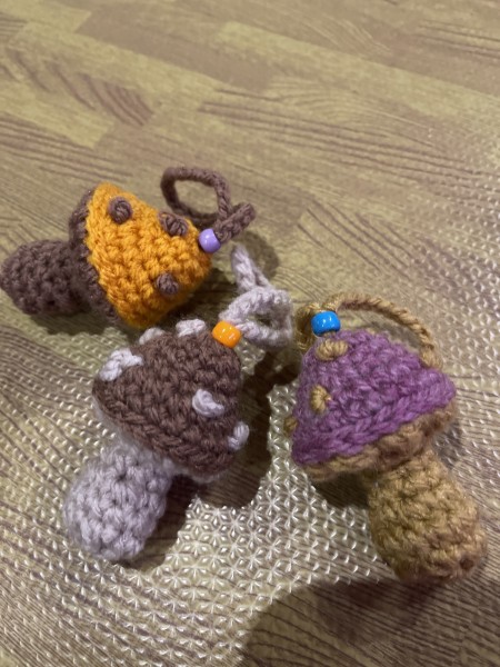 きのこのオーナメントを作りました。ビーズを付けてみましたがあまり目立たない。。。水玉部分ももっと練習です。