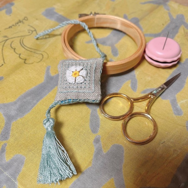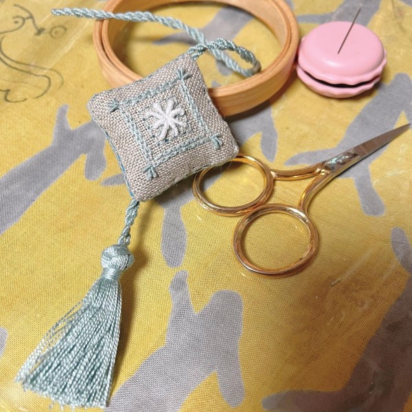 | イタリア刺繍のカサルグイディでシザーキーパーを作りました。 接ぎの部分はイタリアンインサーションステッチしてあります。シザーキーパーとしてでは無く、カバンにつけたいと思ったので紐は長めにDMCコットンパール8番で作りました。タッセルもイタリア刺繍のタッセルにすれば良かったなとおもっています。 |