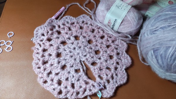 首、肩、背中が寒いけど、着込むほどではないので、軽くて暖かい羽織ものをついつい作りたくなります。