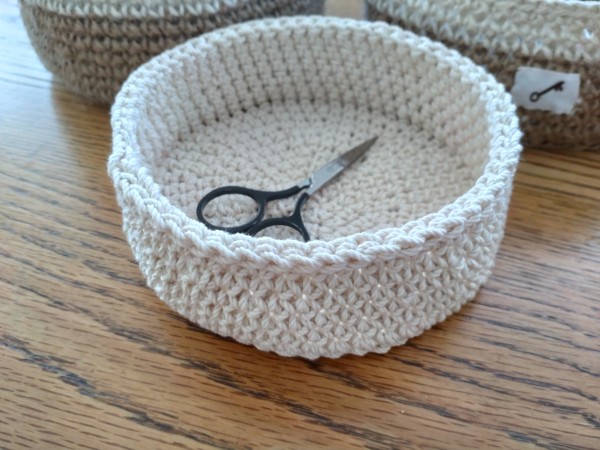 | お友達に頼まれて 小物入れに麻紐のかごを編みました。 久々に麻ひもに手を出して…楽しかったのですが、一気編み注意!案の定 肩が凝って手首が痛いです〜(^_^;) すっぽり重ねられる大(16センチ)中(14.5センチ)小(13センチ)の3個セットです。 ダイソーの120m巻き麻ひも一玉と白のジュートヤーン一玉で調度3つできました。 一番大きい持ち手有りのは自宅用に同じ物を作って玄関に鍵を入れたりして置いてます。 ついでに… タコ糸の残りで 作業する時や毎日飲む薬等卓上の小物を入れたりするかごも余り糸消費でいくつくか作りました。 ちょっとしたカゴ 可愛いし あると便利です♪ |