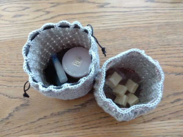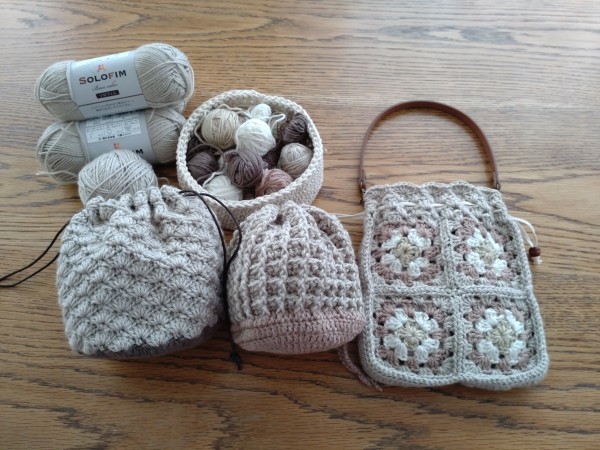 | 余ってたソロフィムを使って巾着ポーチを三種類作りました。 【グラニースクエア2way巾着ポーチ】 短めの糸を使いたかったので久々にモチーフを編みました。 巾着にして 内側にDカンを付けたので持ち手は付けても外しても使えるように。 小ぶりな財布と携帯は入るので お散歩バッグや、持ち手を長いのに付け替えて子供のポシェットにしてもいいかも♪ 【丸い松編み模様の巾着】 化粧ポーチでもアメ入れにでも…と思って作りました。 コロンとした形がカワイイ♪ 【ワッフル編みの巾着】 松編みの巾着より少し小さめにしました。 実は昨日はこれを編む前に一旦UPしたのですが、ワッフル模様も可愛いかも〜と思い立ってダッシュで編んで再編集しました(^_^;) ソロフィムの在庫 大分消費しましたが、ベージュ以外は細々…これもうまく使い終えたいです。 |