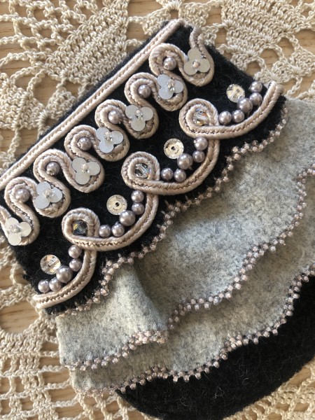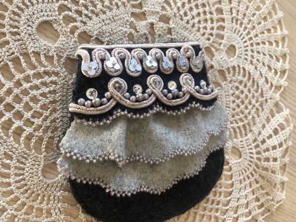 以前、刺繍教室で学んだ時の作品です。コードで綺麗にカタチを作るのが難しく苦戦しましたが、小さなビーズでフリルのように飾るのはとても楽しく心躍りました。