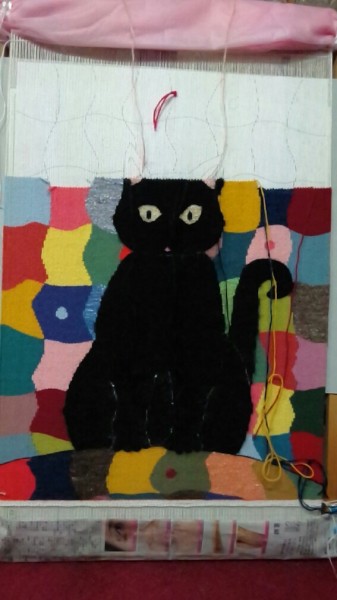 | 平織り。 縦52㎝、横40㎝。 カテゴリーに「織り」が無いので、便宜上「編み物」にしています。 2021年の11月に亡くなった猫のメモリアルタペストリーです。 経糸は麻糸、緯糸は毛糸です。 デザイン起こしから織りあげるまで、約半年かかりました。 これから裏に布を縫い付けて、バーを通し、吊り下げられるようにします。 |