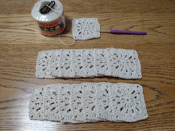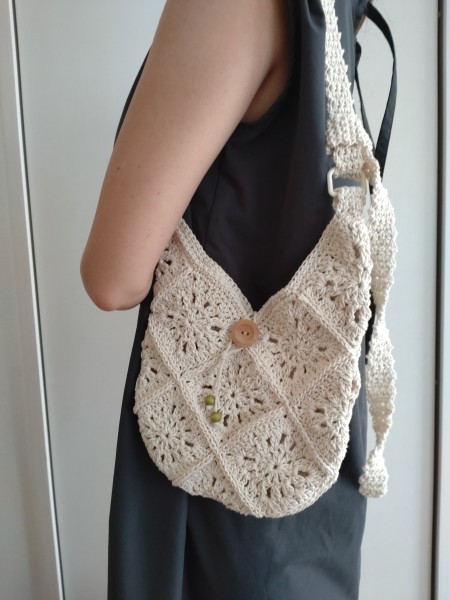 | 残ってたタコ糸をどう使おうか悩んだ末、モチーフを編んだらナチュラルでいい感じだったので、それを15枚編んで繋げてサコッシュにしました。 小さめだけど 財布、ハンカチ、スマホは入るのでちょっとそこまでのお出かけにはちょうど良さそう。 肩紐は両方縫いつけようかと思ったのですが、娘は短めがいいと言うし、私は長めが良いし...Dカンに結んで長さを調節できるようにしました。 |