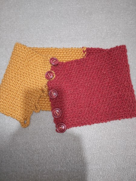 | リネンステッチで編みました、ネックウォーマー。 一番苦労したのは何故かボタン付けですw 普段あまりやらない太い号数だったので、裏に力ボタン付けましたが何か苦労しましたよ。 表はフラットな編み目ですが、裏はポコポコして可愛いので両面使える感じ。 …ボタン止めて輪にしたほうが良かったかもしれない… |