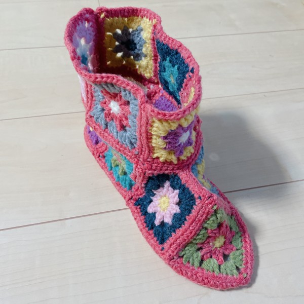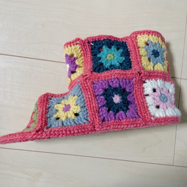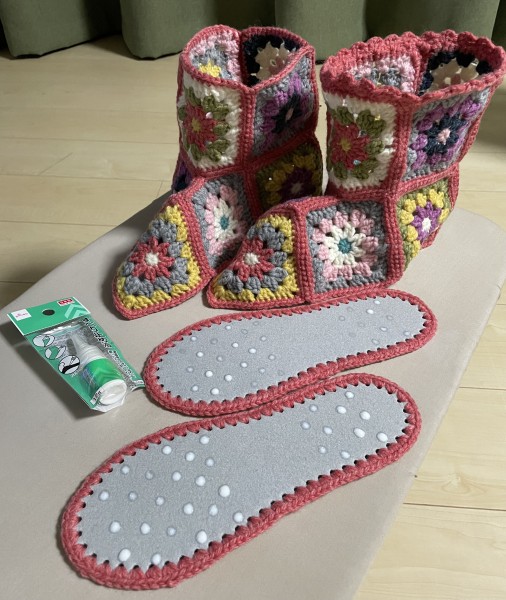 アドバイスに従ってアイロンかけました!また、足先などもう少し余裕が出るように、一つ一つのモチーフを大きくしました。ルームシューズ底に滑り止めを塗って、しめしめもうすぐ完成…と思っていたら、モチーフを左右逆に繋げるのを忘れてたことに気づいてしまった!これだと左側や右側から見た時に側面が左右とも同じ配色のモチーフになってしまいます(ToT)