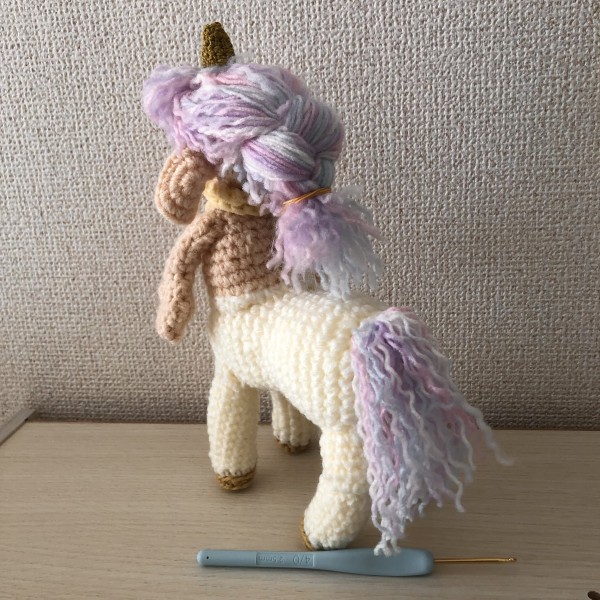 ユニコーンなケンタウロスのあみぐるみです。以前のユニコーン/ペガサスの編み図を参考に首部分をヒトにした感じ。