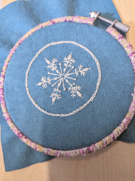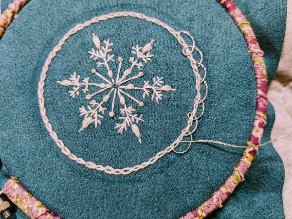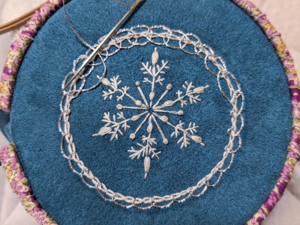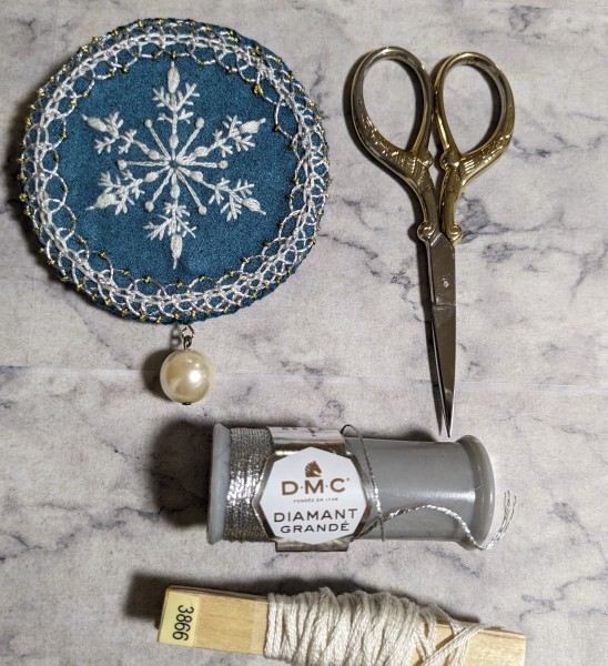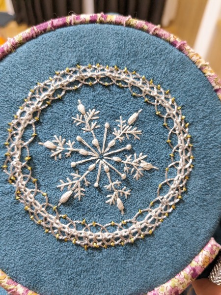 銀と金のDMCディアマンテで枠の飾り刺繍を